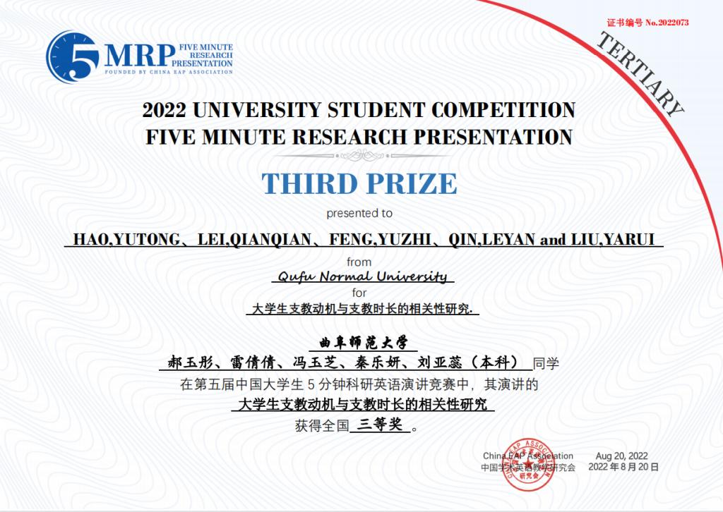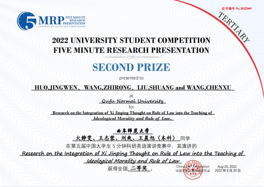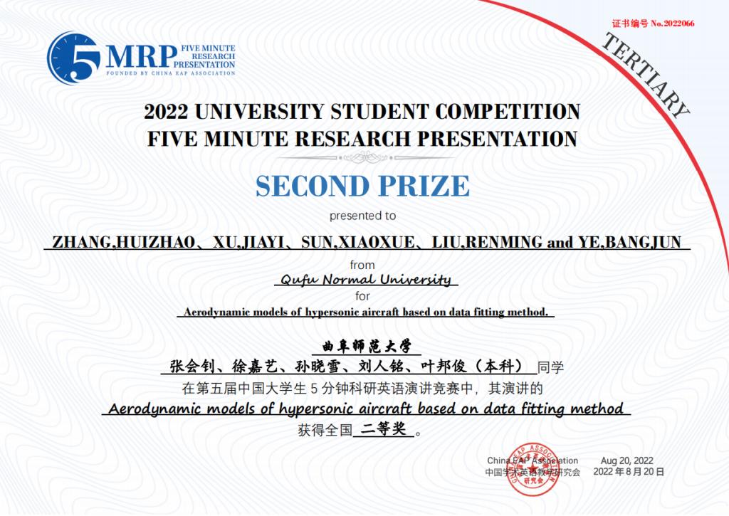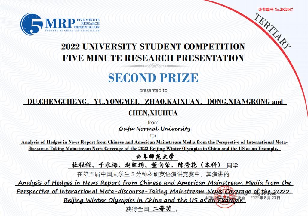 附2:第五届中国大学生五分钟科研英语演讲大赛华体买球_华体(中国)获奖团队获奖证书