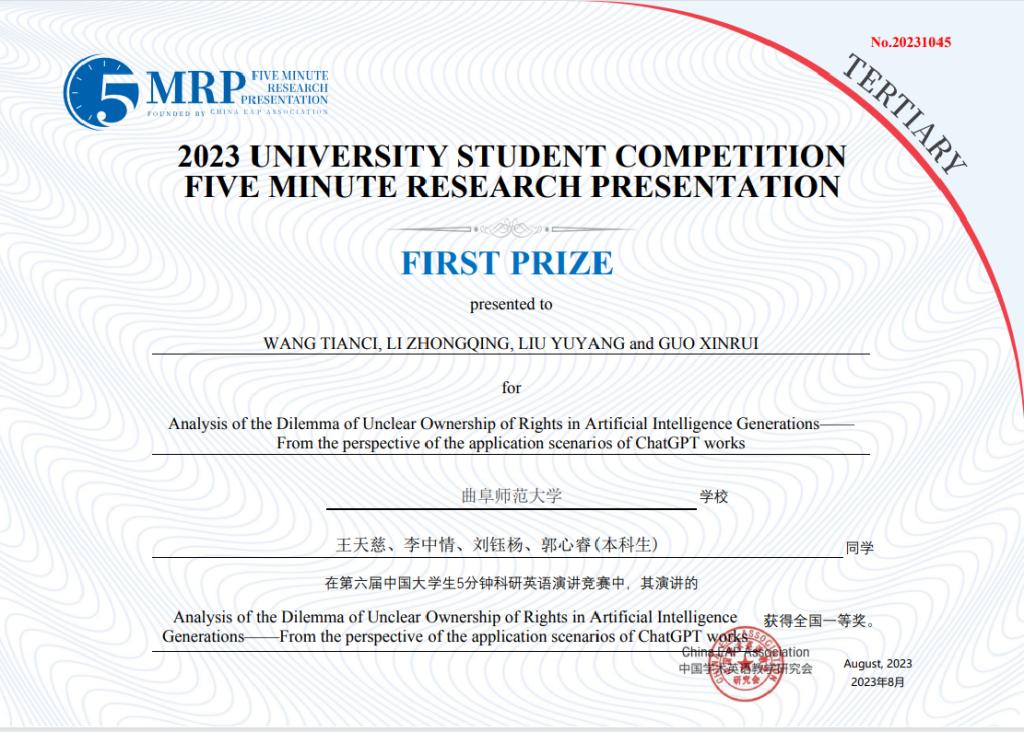 日前,第六届中国大学生5分钟科研英语演讲竞赛决赛(非医科类)在同济大学成功举行。由华体买球_华体(中国)选拔推荐的16支团队取得优异成绩,获得全国一等奖1项、二等奖6项、三等奖9项。其中,由王天慈、李中情、刘钰杨、郭心睿等四位同学组成的团队作品“Analysis of the Dilemma of Unclear Ownership of Rights in Artificial Intelligence Generations — From the perspective of the application scenarios of ChatGPT works”荣获全国一等奖。此外,其他16支参赛队伍分获校级一、二、三等奖。宋兆娟、李梦实等25位老师荣获优秀指导教师奖。