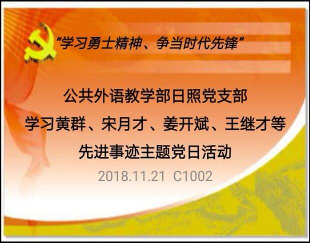 2018年11月21日下午3点,华体买球_华体(中国)日照党支部在C1002举行“学习勇士精神、争当时代先锋”——学习黄群、宋月才、姜开斌、王继才等先进事迹主题党日活动。会议由支部书记杜庆凤主持,全体党员以及党员发展对象参加。