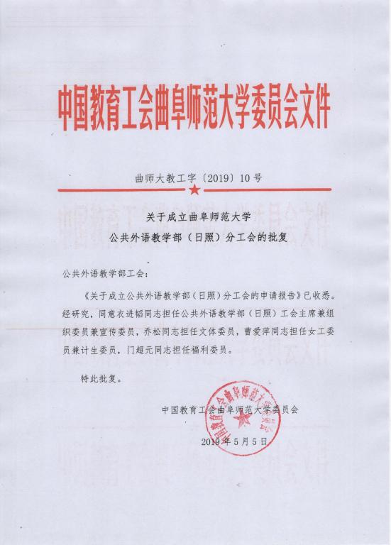 曲师大教工字〔2019〕10号关于成立华体买球_华体(中国)华体买球_华体(中国)(日照)分工会的批复