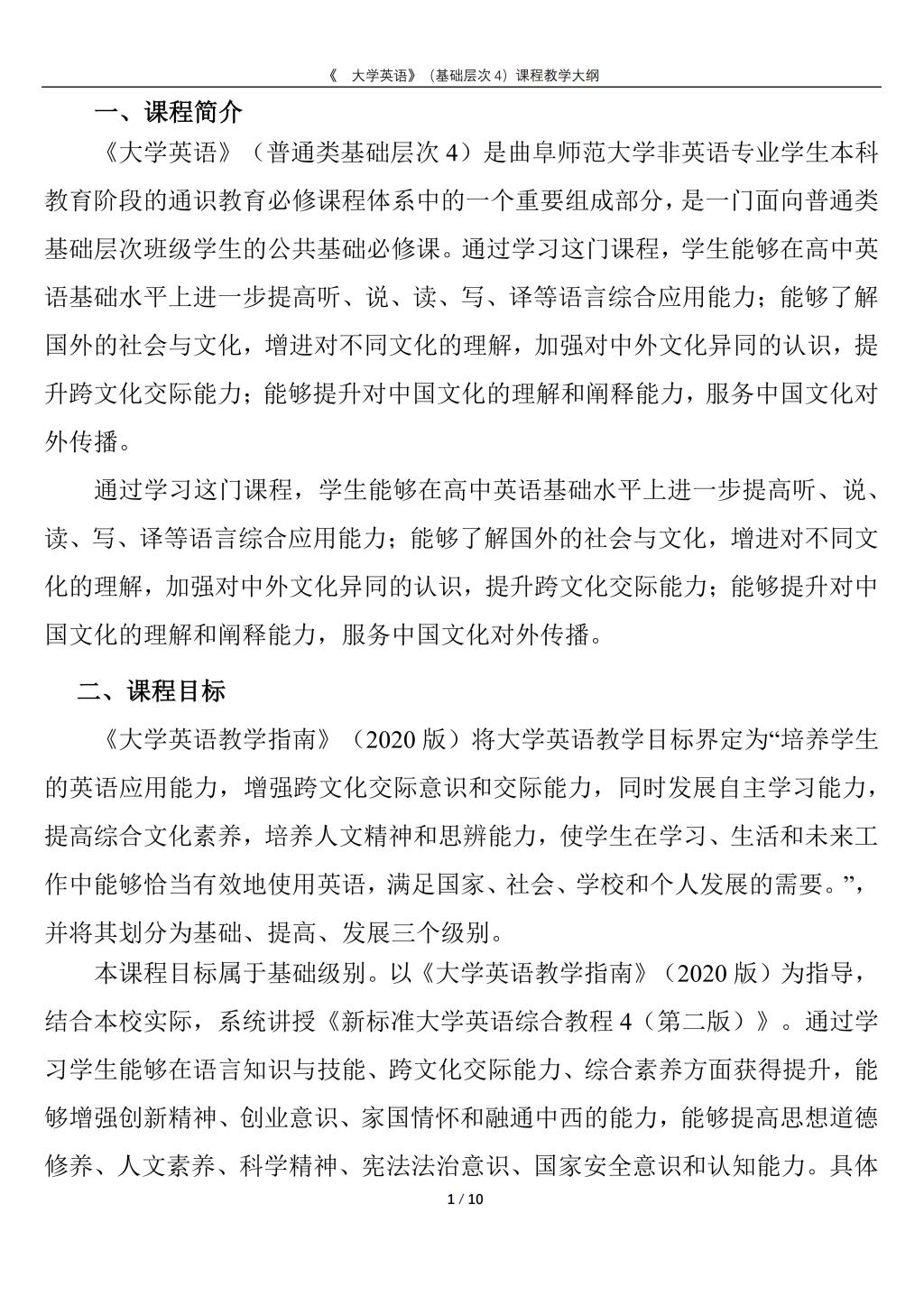 大学英语(普通类基础层次4)课程教学大纲(2022版)