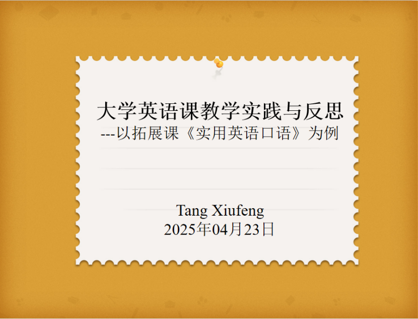 2025年4月23日,华体买球_华体(中国)组织全员研训活动,聚焦大学英语教学实践与反思主题。活动中,唐秀峰老师以拓展课《实用英语口语》为例,分享了自己的教学经验与教学反思,为在场教师带来了新思路和新启发。研训中,唐老师从教学准备、课堂管理、技术应用、学生互动和评估反馈等多个关键维度展开分享。
