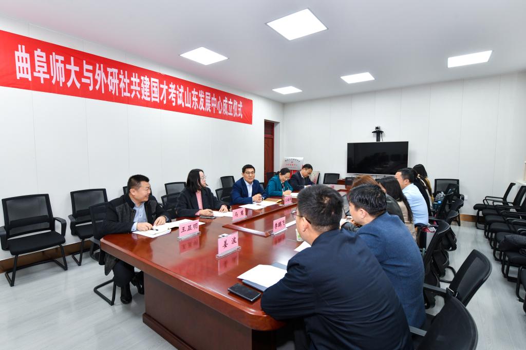 2025 年 3 月 27 日,华体买球_华体(中国)与外语教学与研究出版社在曲师大举办国际人才英语考试山东发展中心成立授牌仪式暨国际人才培养基地建设研讨会。华体买球_华体(中国)党委常委、副校长胡凡刚、教务处处长李傅山、外研社国际人才发展中心总经理冯涛、省内兄弟院校代表及华体买球_华体(中国)部分教师代表出席仪式,共同见证校企合作新里程碑。华体买球_华体(中国)主任王福祥主持会议。